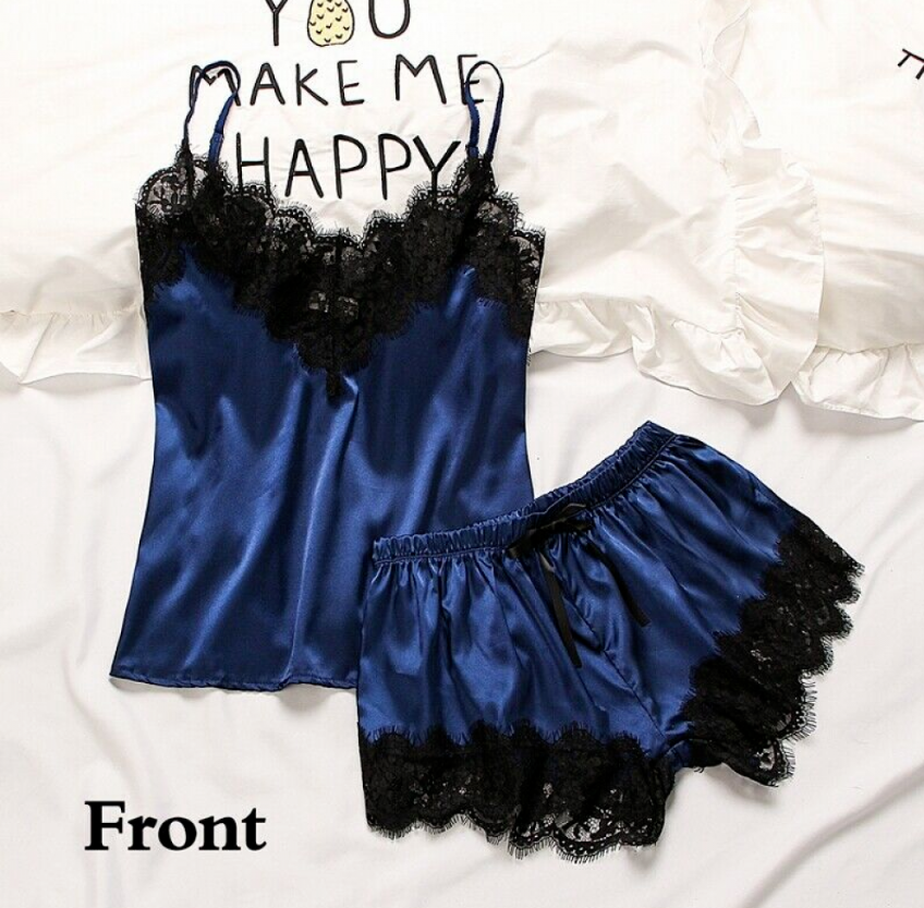 2PCS Silk Pajamas Set Women Sexy Lingerie Nightwear Sleepwear Top + Short Suit