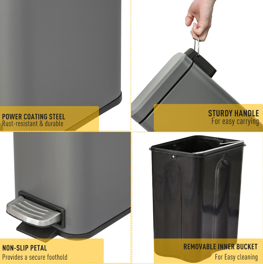 5L Rectangle Compact Bin Steel Body Inner Bucket Quiet-Close Lid w/ Pedal Grey
