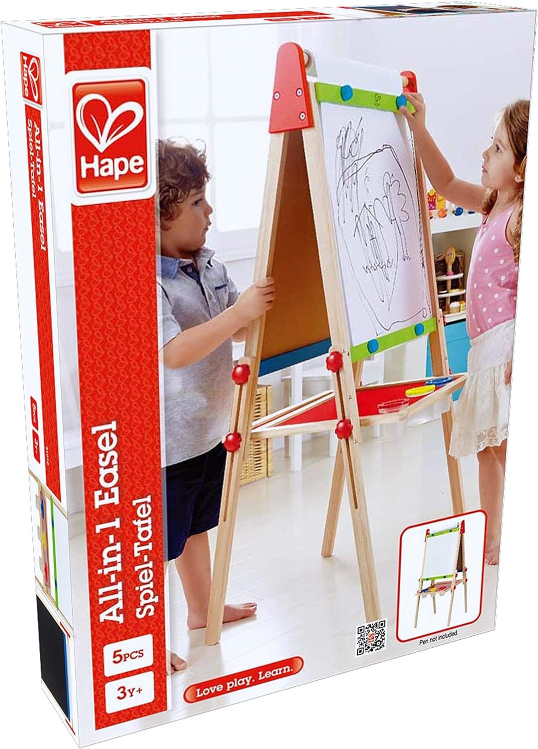 This all-inclusive easel really has it all! The best-selling All-in-One Easel from Hape features a magnetic whiteboard on one side, and an easily erasable chalkboard on the other, as well as a convenient refillable paper roll. The height is fully adjustable to three different levels, encouraging artists young and old. Special screw down clamps keep your paintings and drawing nice and flat for the best artistic experience. Includes color coded sealable pots for paint, and a large tray to hold all your artistic utensils. Some easy assembly required for this compact and easily storable easel. Made from wood sourced from environmentally sustainably sourced forests. Durable child-safe paint finish and solid wood construction make this a toy your child will love for years to come. Hape toys stimulate children through every stage of development and help nurture and develop their natural abilities. All Hape products sold in North America meet or exceed all applicable safety standards. The All in One Art Easel is the proud recipient of the Oppenheim Toy Portfolio Gold Seal Award for 2014. Do not wash