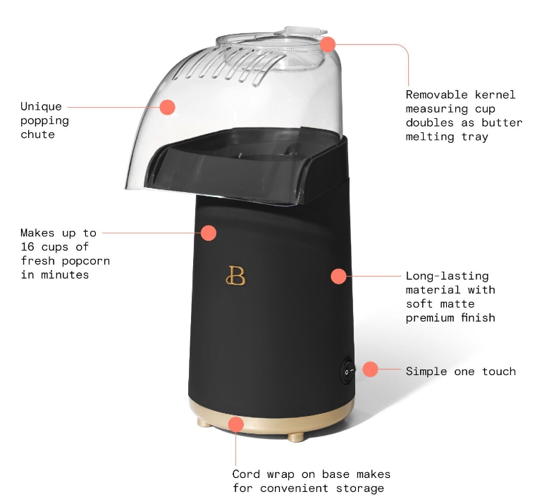 Superior cyclonic air flow technology for faster popping Makes up to 16 cups of fresh popcorn in minutes 1200watt heating system for quick popping No oil needed – pops with hot air for healthier popcorn Removable kernel measuring cup doubles as a butter melting tray Unique popping chute guides popcorn directly into the bowl Simple one touch: add kernels and start popping Long lasting material with soft matte premium finish Cord wrap on base makes for convenient storage Dishwasher safe parts for easy cleaning