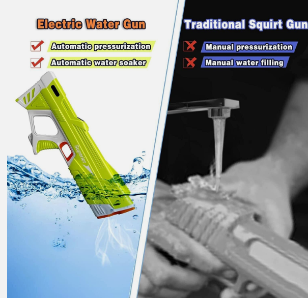 : Electric water gun refers to the ability of the toys to automatically draw in water from a nearby source, such as a pool or bucket. This makes the pool toy more convenient for the kids, as they do not need to manually refill.