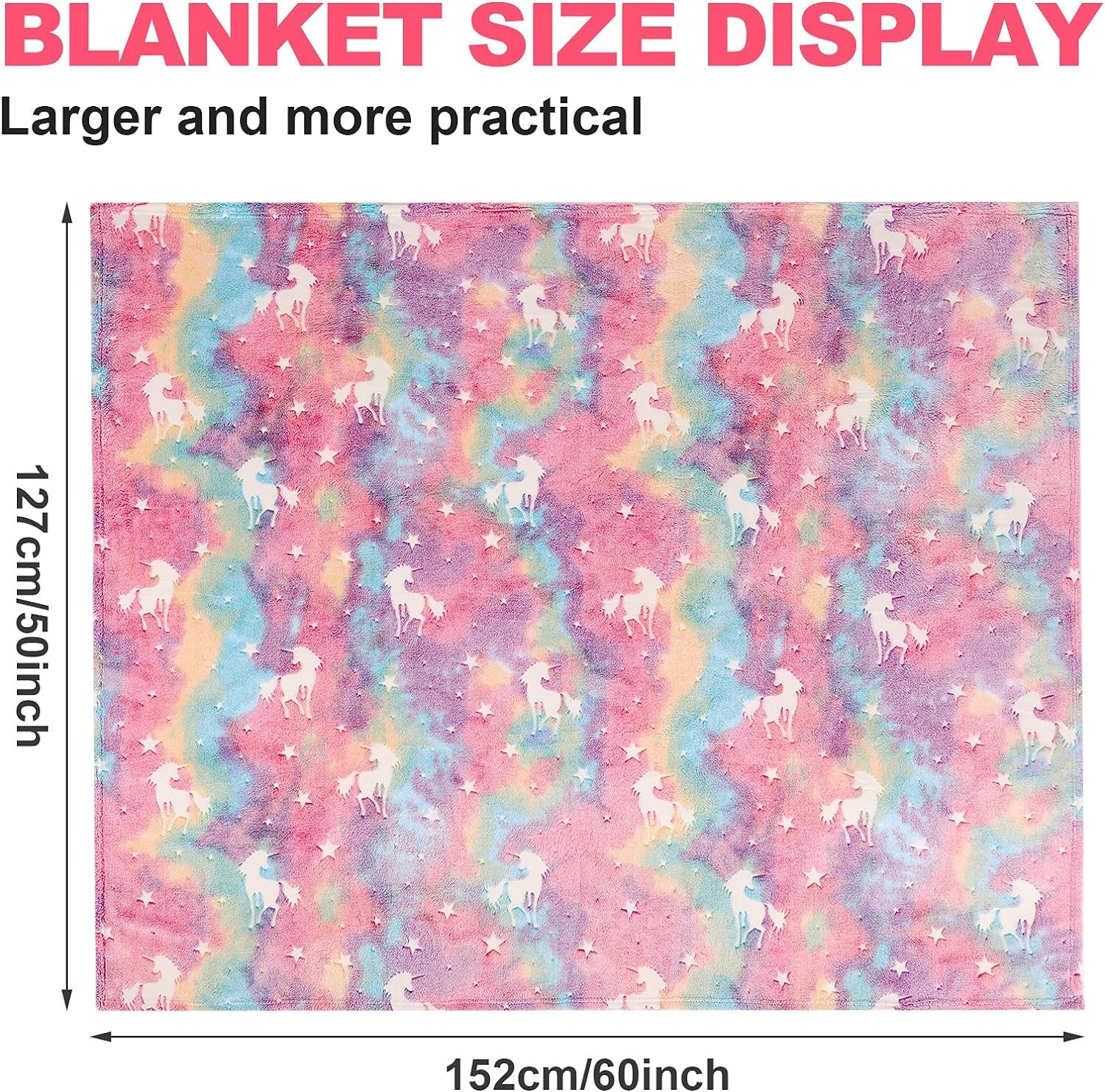 • ☆[Glow In The Dark]:Our pink unicorn blanket can shine in the dark. Just expose it to a bright light source or sunlight for about ten minutes. Brighter the light, the stronger the blanket will be in the dark.Glow blanket also unicorn party supplies as unicorn costumes for girls.Is funny girl toys,great as toys for 1-10 year old girls.3 4 5 6 7 8 9 10 year old girl gifts ideas.
