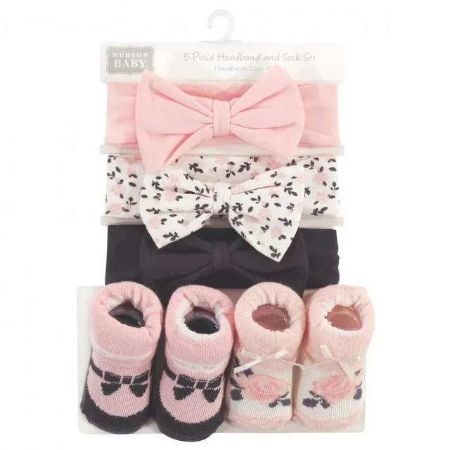 Hudson Baby Infant Girl Headband and Socks Set 5pk, Berry Floral, 0-9 Months