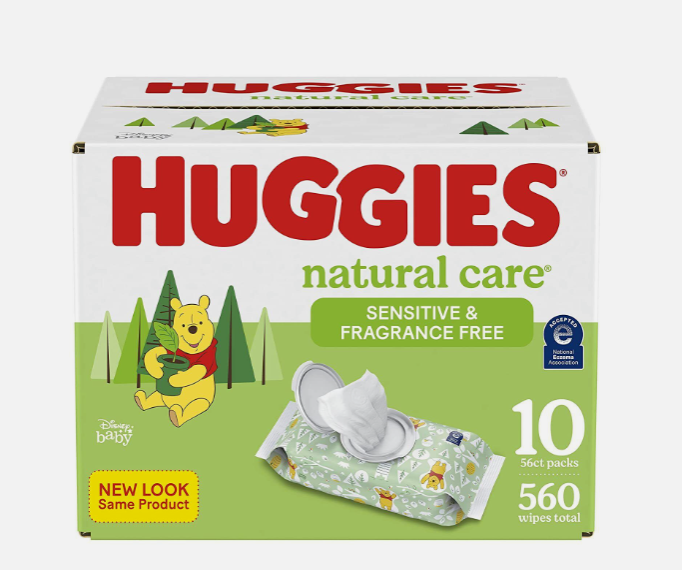 • 10 flip-top packs of 56 Huggies Natural Care Sensitive Baby Wipes, Unscented (560 wipes total); National Eczema Association Seal of Approval