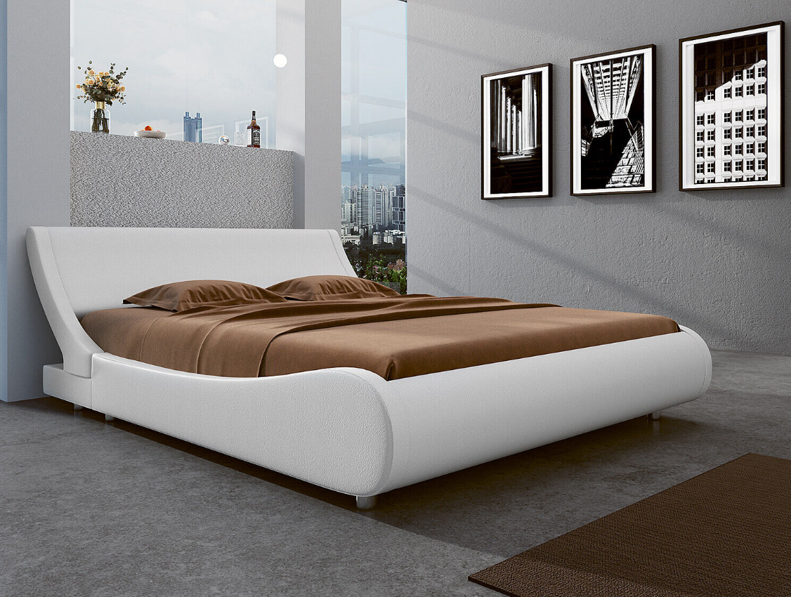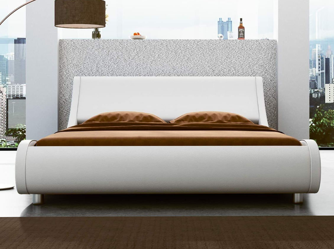 King Size Leather Low Profile Sleigh Platform Bed Frame with Headboard,White