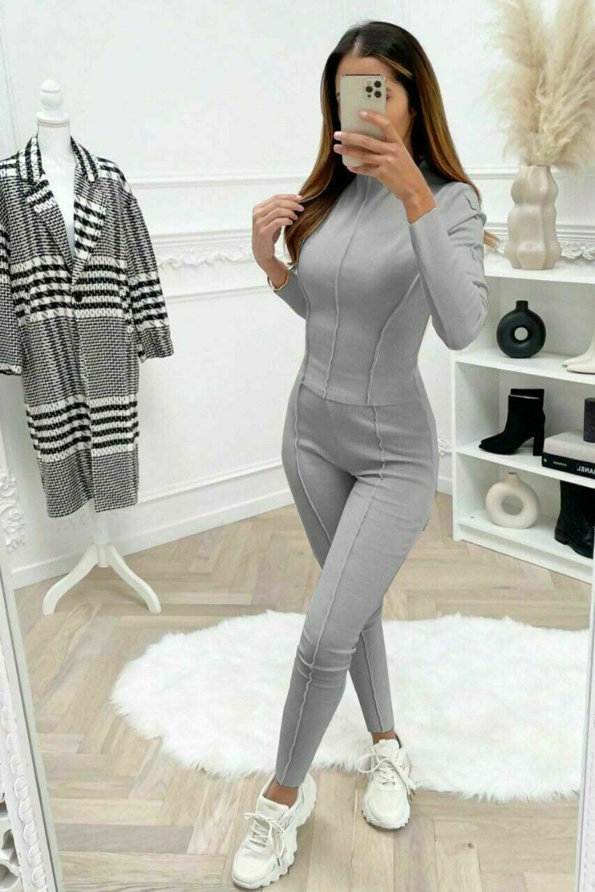 Ladies Womens Overlock Ribbed Top Leggings 2 piece Loungewear Tracksuit Set