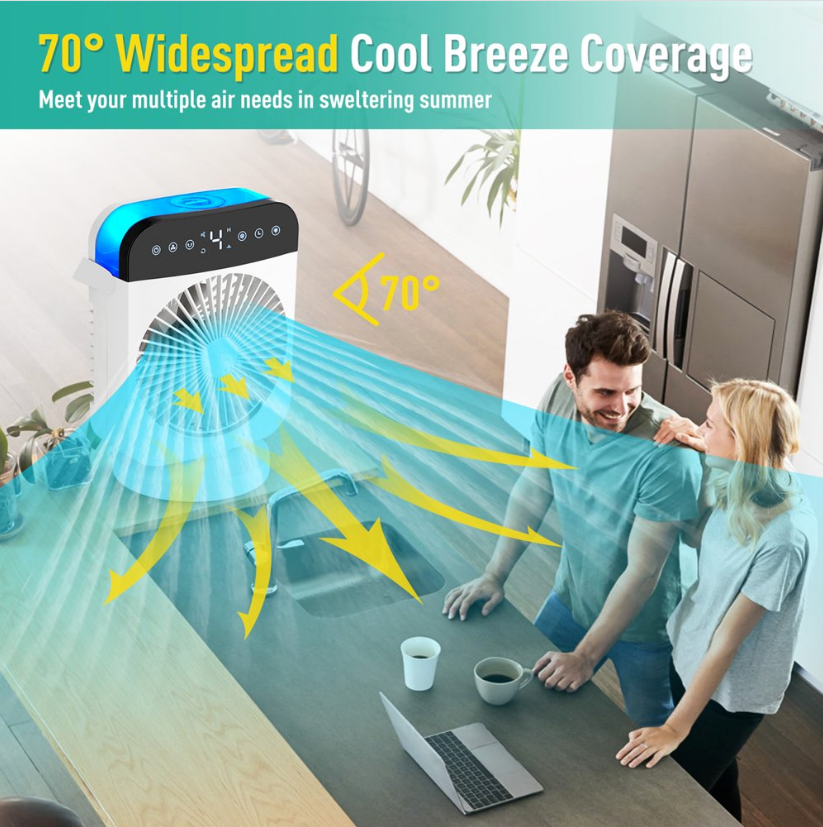 • ❄【Auto Oscillation & Soft Night Light】The air cooler with 70° oscillation design support rotation like a desk fan, circulating air while enlarge cooling area, cooling your surrounding evenly. Soft blue LED light can be used as a night light, unlimited brightness adjustment, which help you with better sleep.