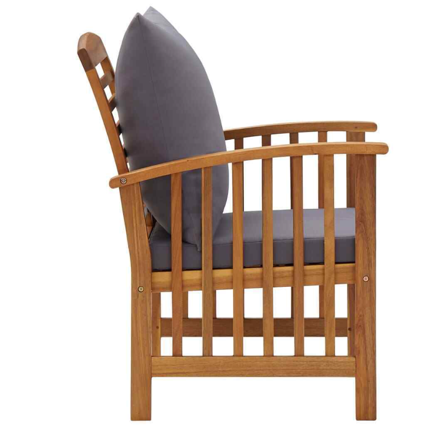 The outdoor chair is made of solid acacia wood with an oil finish, making it stable and durable. The craftsmanship and the beautiful wood grains make every piece of furniture well-defined and slightly different from the next. The seat cushion and back pillow add extra seating comfort to the chair.