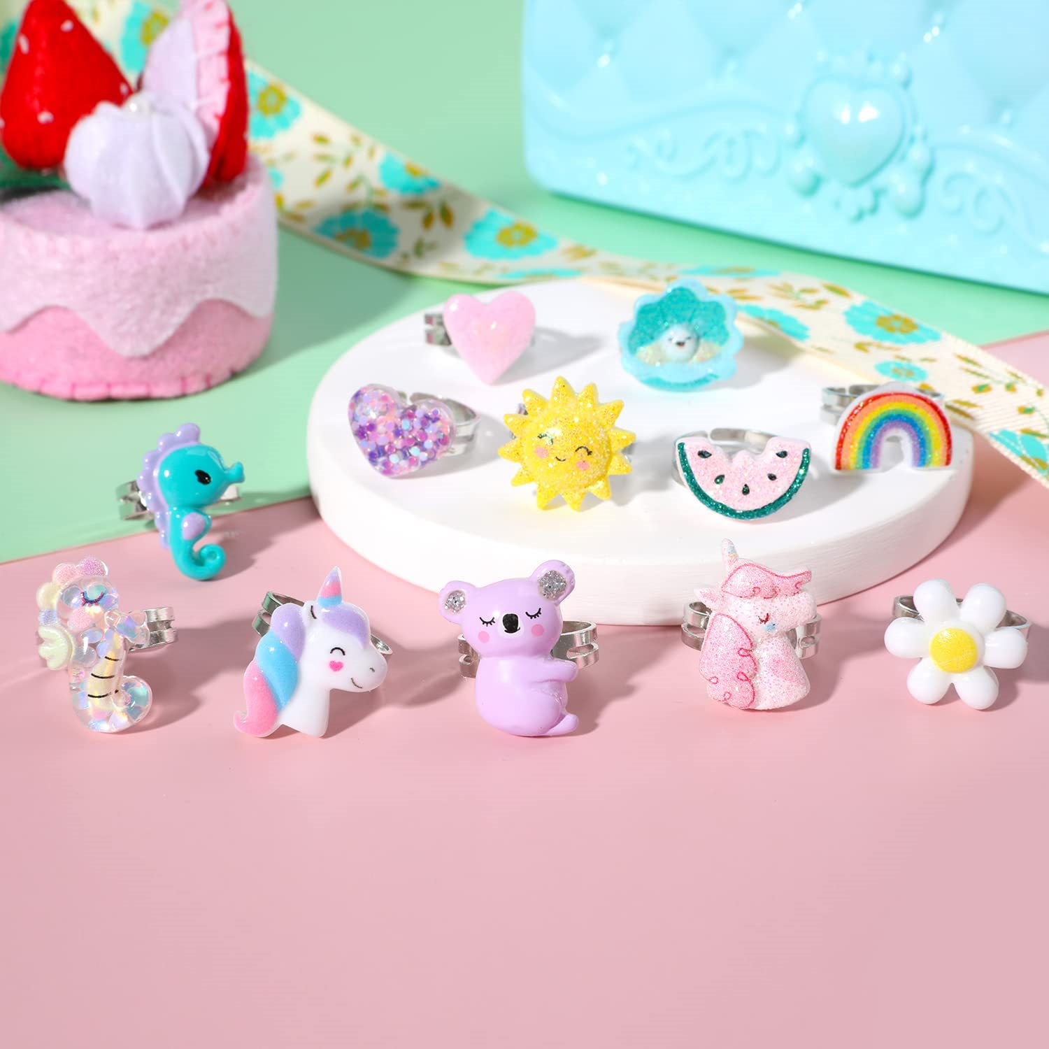 PinkSheep Little Girl Jewel Rings in Box, Adjustable, No Duplication, Girl Play