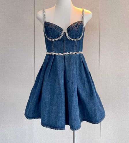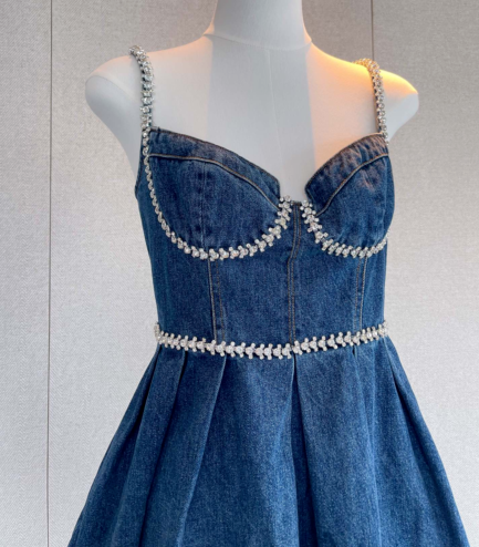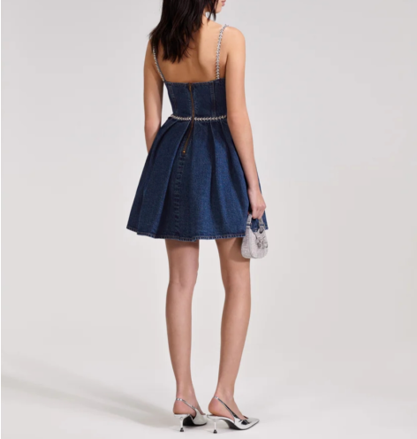Self-Portrait Cotton Denim Slip Dress Diamante Backless Mini Dress for Women New