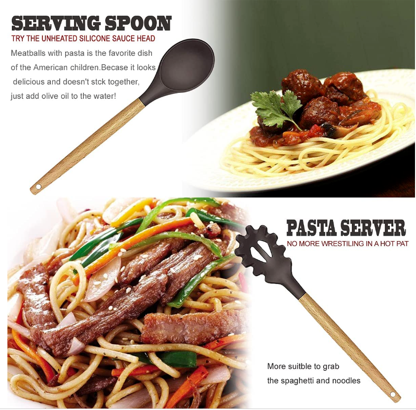 • : It includes slotted spatula, slotted spoon, flexible spatula, slotted Turner, solid turner, pasta server, solid spoon, kitchen tongs, draining spoon, whisk, deep soup ladle, spatulas and brush. A complete set that meets your daily needs.