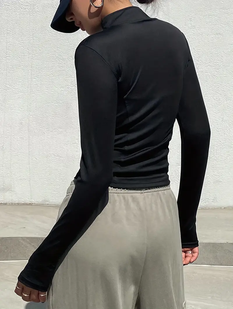 Solid Zipper Front Slim Top, Versatile Long Sleeve Mock Neck Top For Spring & Fall, Women's Clothing