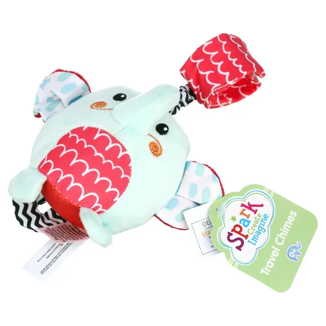 The Spark Create Imagine Blue Elephant Travel Chimes are soft plush toys that give an engaging chime sound when shaken. This elephant toy incorporates crinkle feature for additional tactile stimulation. The bright colors and patterns as well as its friendly face will provide visual stimulation and keep your child engaged. The 3.5” travel chimes are soft to touch and easy to grab; made for tiny hands. The strap at the top of the toy allows it to be attached to bags, strollers, carriers or car seats for use at home and on the go. It encourages grasping, movement, sensory development and interaction in babies, and is suitable for children of all ages.