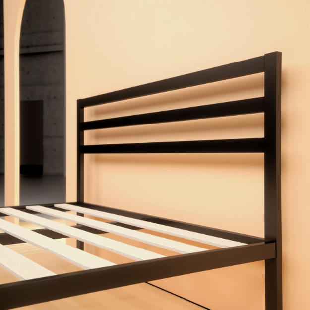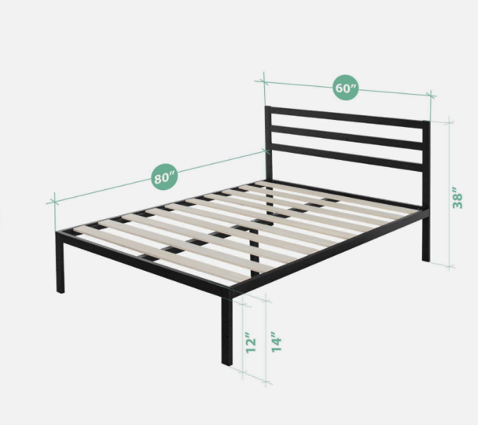 Made with bold style and optimum strength, the steel framed Mia Platform Bed with Headboard features a thick black metal frame and wooden slats that provide strong support for your memory foam, latex or spring mattress without the need for a box spring. And at 14 inches high, it offers over a foot of clearance under the frame for valuable under bed storage so you can tuck your extra boxes or bins neatly away. Crafted with clean lines and a streamlined look, this contemporary modern design looks classic and composed in just about any home. We ship this bed and everything you need to seamlessly assemble it in one slim and compact box that arrives at your doorstep. It’s all ready to be set up in under an hour with the help of a friend. And best of all, it includes a 5-year worry-free warranty guaranteed to keep you from ever losing any sleep over this purchase. Who would have guessed that stylish and strong mattress support could be this simple, convenient and affordably priced?